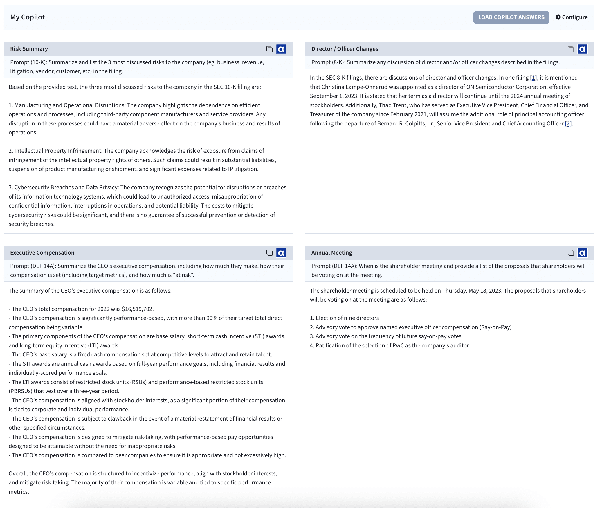 On every company’s overview page users can define Custom Copilot Widgets that will return answers to question that they most frequently want answered regarding a company. For analysts at an insurance company this may be questions around risk profile and for activist investors it may be questions about the company’s bylaws and governance practices.