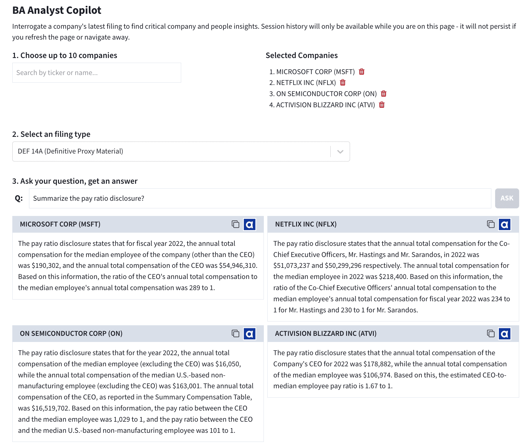 The Analyst Copilot Tool page enables users to ask complex questions of SEC filings across multiple companies at one time. This is often used by customers to accelerate deep-dive research across peer sets.