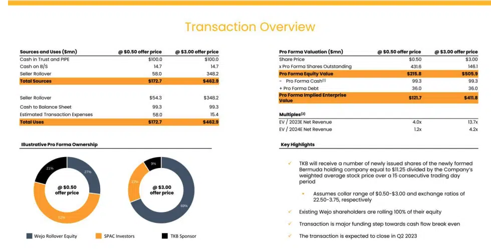 • Another former DeSPAC merger, albeit this time Wejo Group Ltd. (WEJO) will be merging with a different SPAC, TKB Critical Technologies 1 (USCT). Wejo originally went public in 2021 via Virtuoso Acquisition Corp. at an $800M EV. The new transaction values WEJO from $112M — $412M depending on the ultimate outcome.
