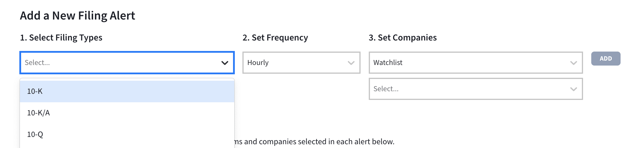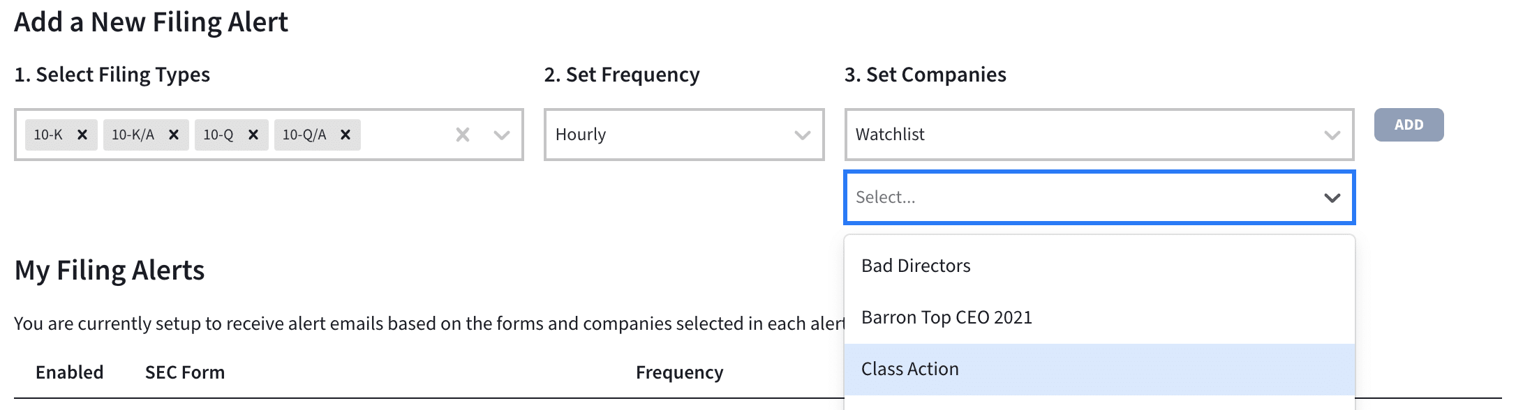 2. Add a new SEC Filing Alert by Selecting the Forms, the Frequency, and the Companies